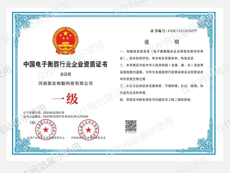 中國(guó)電子衡器行業(yè)企業(yè)資質(zhì)證書(shū)